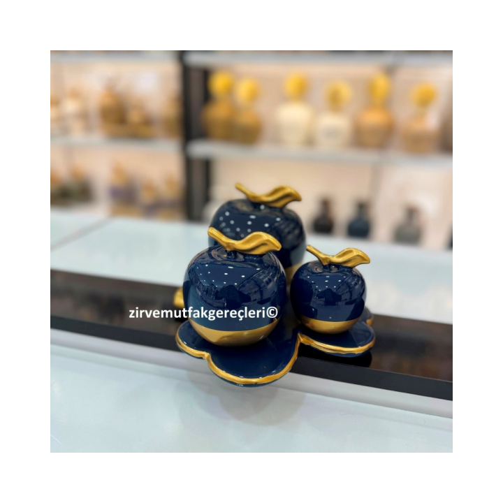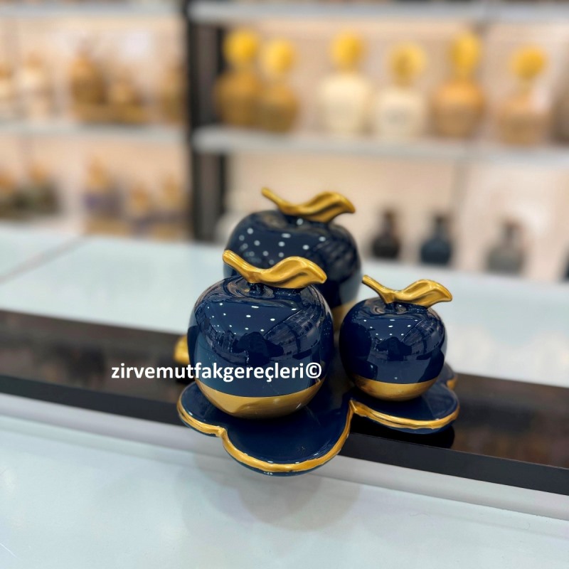 3 Pcs Apple Accessory with Plate with Gold Line - Night Blue - Zirve Mutfak Gereçleri San.Tic.Ltd.Şti.